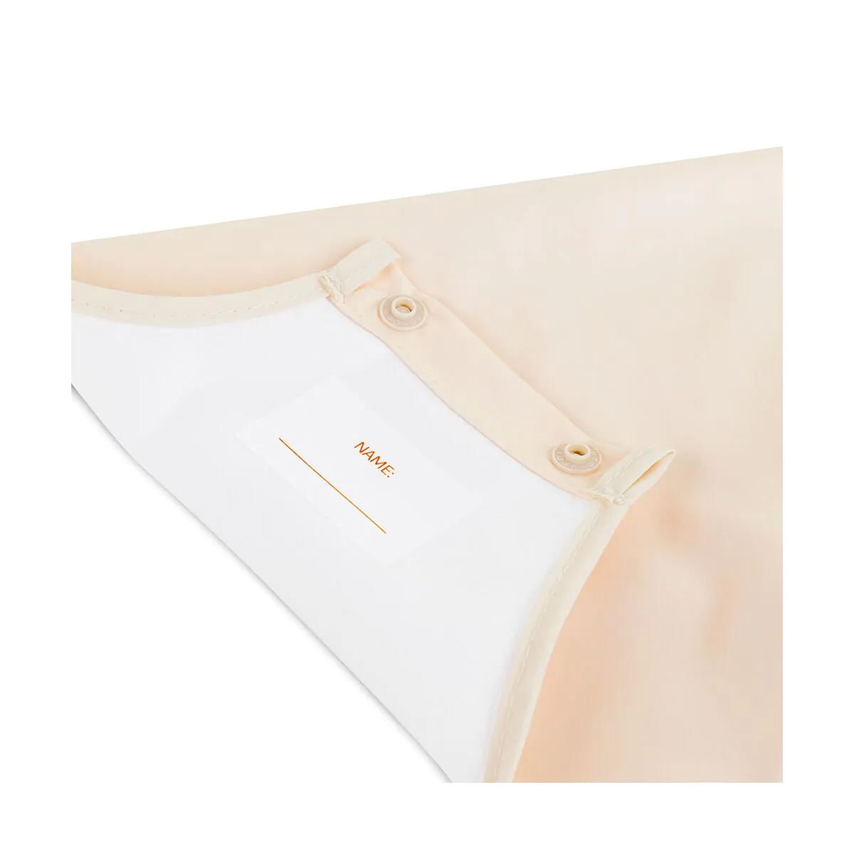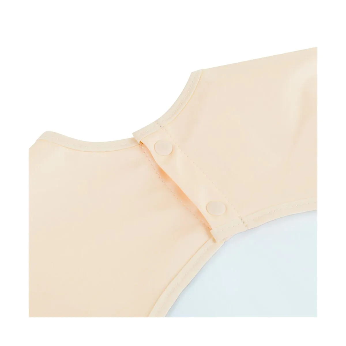 Gummibandet vid armarna förhindrar att barnets kläder fläckas, och det är stängning med två knappar vid halsen. Det ger en perfekt passform och gör det lätt att anpassa i olika storlekar. Den stora fickan hjälper till att fånga upp matrester eller vätskor, vilket gör dem idealiska för användning hemma, på dagis eller på resa.