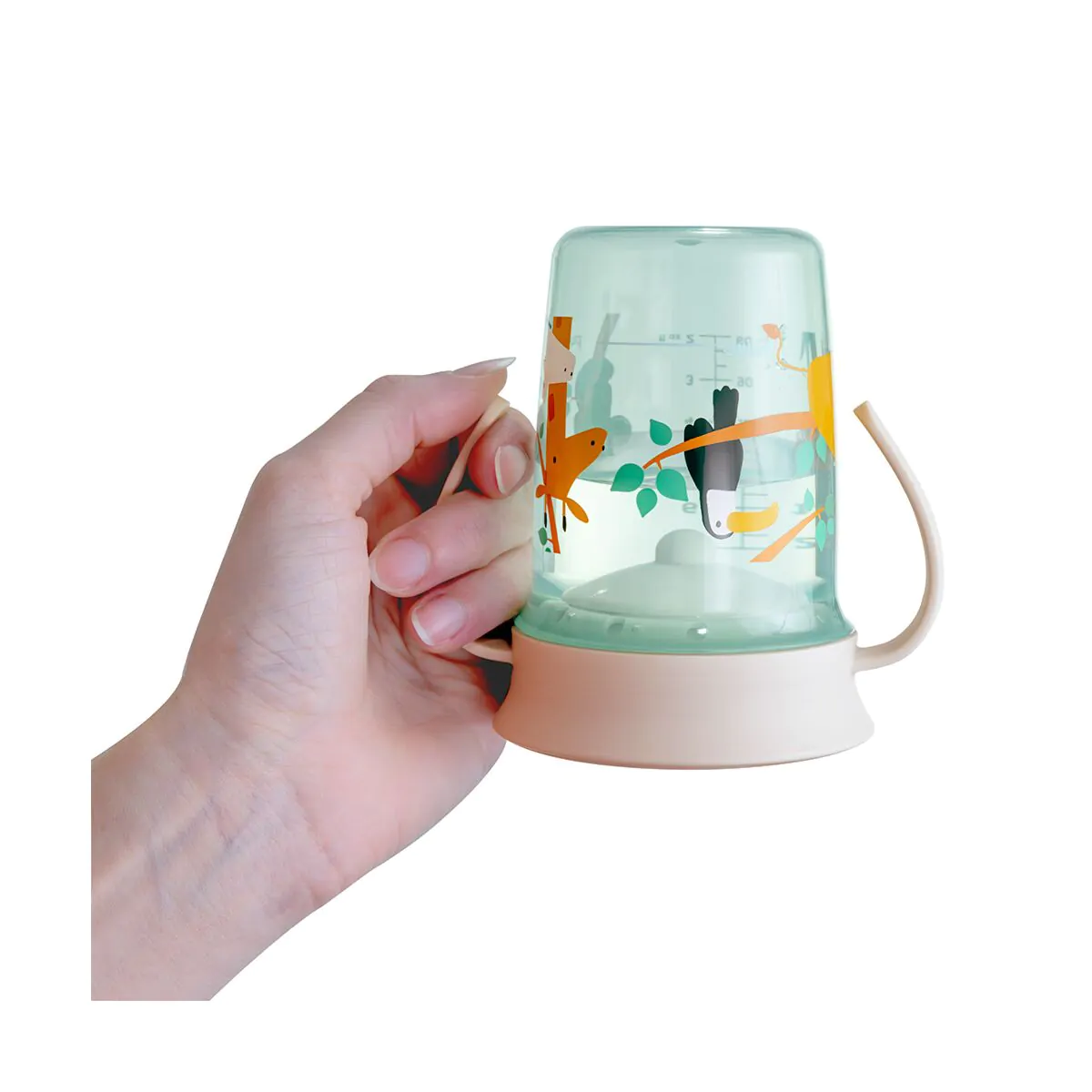 Muggen har ergonomiska handtag, som barnet har lätt att greppa. Samt ett tätt lock som gör muggen idealisk för att ta med sig vart som helst utan att oroa sig för spill.